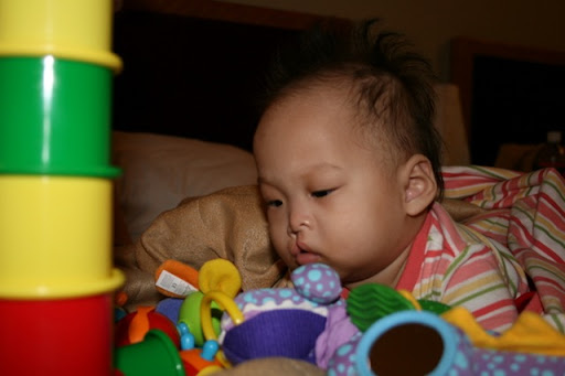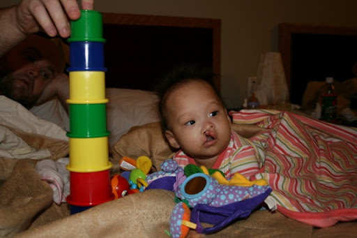 Fun with blocks. She was completely fascinated by stacking them up and breaking them back down. It's hard to conceive that she has had little to no contact with toys for her entire life. At this point, she just stares at the toys like they're aliens.