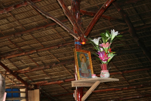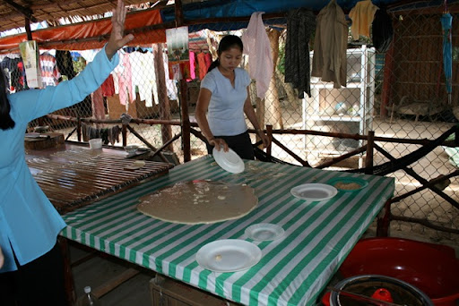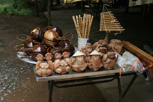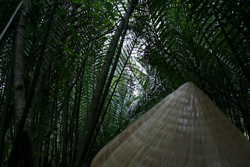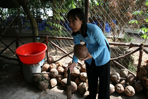 This is our tour guide, Kim, showing us how they spike open the coconuts at the candy workshop. At first, she would begin each sentence with "Ladies and gentlemen" then I think she realized that wasn't really necessary. She was very friendly. Towards the end of the tour, she said that we must be the richest people there because we have our own private airport (referring to the bald strip on the top of my head that one could land a plane on). She thought that was real funny until I gave her 500 dong for a tip--16,000 dong equal one US Dollar. (Just kidding, of course.)
