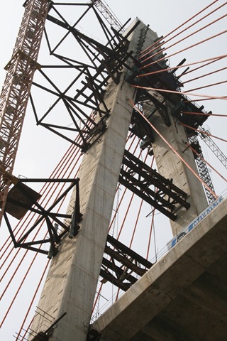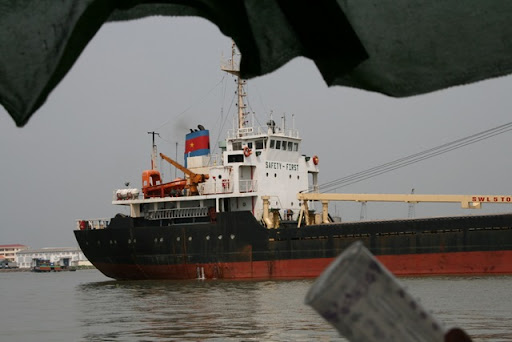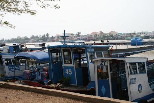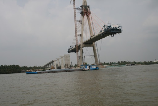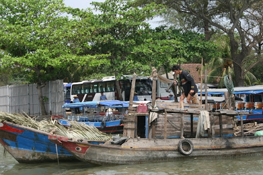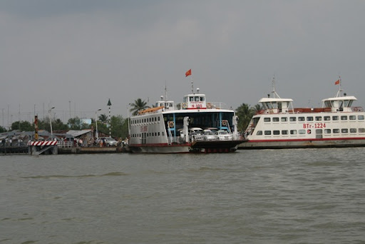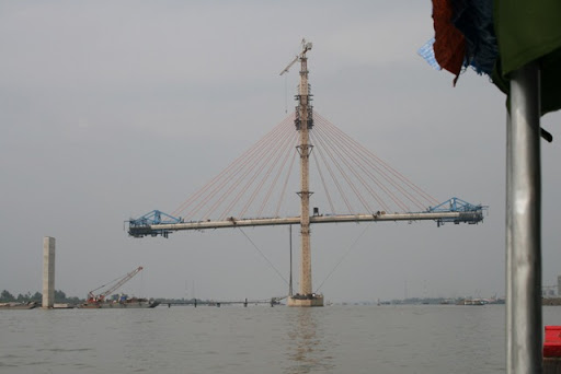 As of now, there is no bridge over the Mekong River (at least at this point, or anywhere along it) so people have to take ferries. This bridge will be done within a few years.