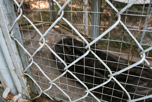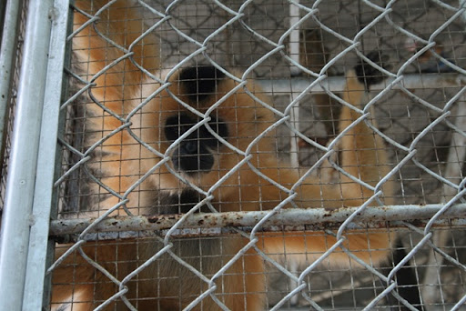 This gibbon would reach through the bottom of his cage and grab anything he could get his hands on. He managed to grab Dani's knee as she walked by.
